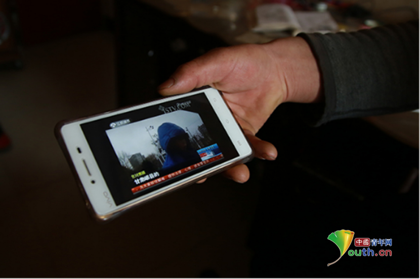 村民李治平手機中關于岷縣乞討人員的新聞視頻,該視頻系幾年前所拍攝。中國青年網記者 孫釗 攝