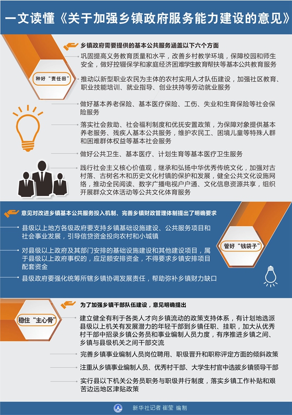 新形勢下,鄉(xiāng)鎮(zhèn)政府的基本公共服務職責有哪些?如何管好鄉(xiāng)鎮(zhèn)政府的“錢袋子”?如何為基層干部“強筋健骨”,穩(wěn)住鄉(xiāng)鎮(zhèn)的“主心骨”?中共中央辦公廳、國務院辦公廳近日印發(fā)《關于加強鄉(xiāng)鎮(zhèn)政府服務能力建設的意見》,對加快鄉(xiāng)鎮(zhèn)政府職能轉(zhuǎn)變等提出了新目標、新任務、新要求。