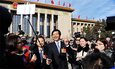 所以上面兩會美女拿的Osmo Mobile正好解決這個問題。不僅如此,它還可以自拍(這個后面會展開講),看起來比下面這款高級點。