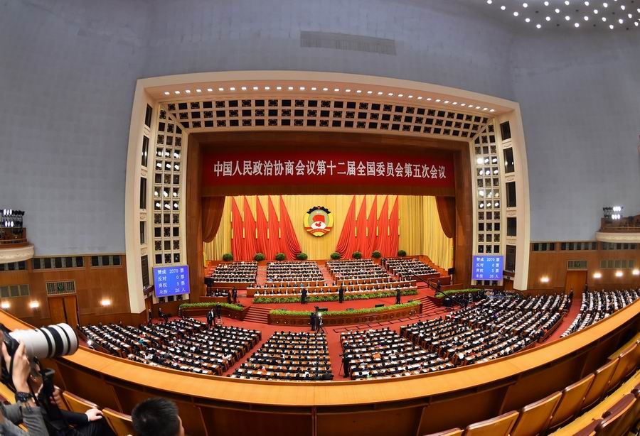 全國(guó)政協(xié)十二屆五次會(huì)議于3月13日上午9時(shí)30分在人民大會(huì)堂舉行閉幕會(huì)。通過(guò)人事事項(xiàng),通過(guò)政協(xié)第十二屆全國(guó)委員會(huì)第五次會(huì)議關(guān)于常務(wù)委員會(huì)工作報(bào)告的決議,通過(guò)政協(xié)第十二屆全國(guó)委員會(huì)提案委員會(huì)關(guān)于政協(xié)十二屆五次會(huì)議提案審查情況的報(bào)告,通過(guò)政協(xié)第十二屆全國(guó)委員會(huì)第五次會(huì)議政治決議。人民網(wǎng)記者 于凱 攝