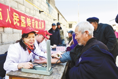河北邢臺市人民醫院的醫務志愿者組成愛心醫療小分隊,為太行山區的留守、孤寡老人義診。圖為3月19日,醫生正在為村里老人測量血壓。記者 史自強攝