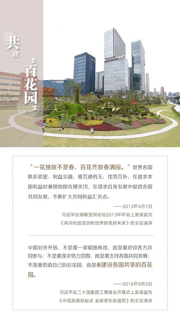 2016年G20杭州峰會上,習近平說,中國對外開放“不是要營造自己的后花園,而是要建設各國共享的百花園”。