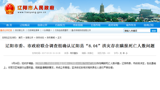 3月29日,經(jīng)初步調(diào)查,遼陽(yáng)市委、市政府聯(lián)合調(diào)查組確認(rèn)遼陽(yáng)縣2012年“8.04”洪災(zāi)存在瞞報(bào)死亡人數(shù)問(wèn)題。遼陽(yáng)市委、市政府決定,在此基礎(chǔ)上,對(duì)受災(zāi)區(qū)域進(jìn)行全面核查,徹底查清瞞報(bào)事實(shí),并成立專(zhuān)案組,堅(jiān)決依紀(jì)依規(guī)對(duì)相關(guān)責(zé)任人進(jìn)行嚴(yán)肅處理。