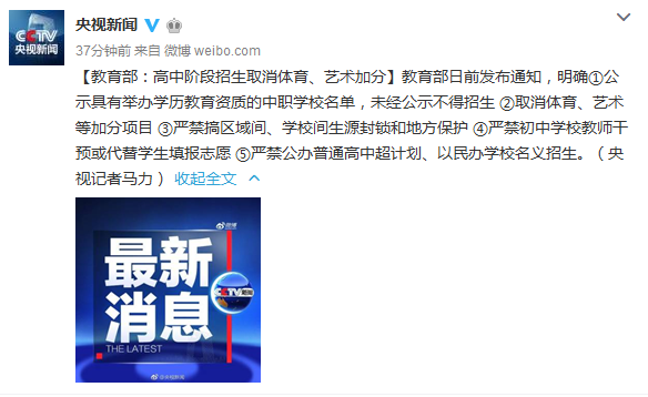 【教育部:高中階段招生取消體育、藝術加分】教育部日前發布通知,明確①公示具有舉辦學歷教育資質的中職學校名單,未經公示不得招生 ②取消體育、藝術等加分項目 ③嚴禁搞區域間、學校間生源封鎖和地方保護 ④嚴禁初中學校教師干預或代替學生填報志愿 ⑤嚴禁公辦普通高中超計劃、以民辦學校名義招生。