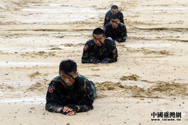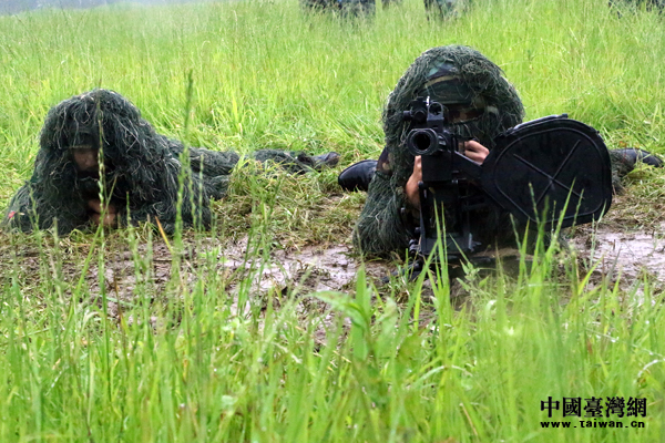 參加反恐演練的狙擊手匍匐在泥水里。(中國臺灣網 陳佳慧 攝)