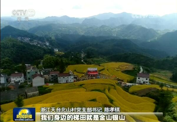 在浙江天臺蒼山南麓的北山村,一年一度的香米節正式開鐮,村民在慶祝豐收的同時,也將喜迎十九大的喜悅心情刻在了梯田上、稻田里。
