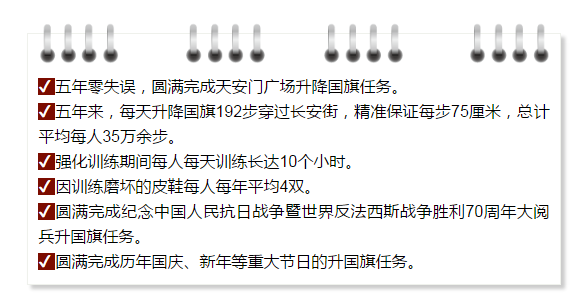 無論狂風暴雨,酷暑隆冬,數年來,36名國旗護衛隊的官兵準時在天亮之前起床、整理、訓練。踢正步磨破的皮鞋,練習端槍磨破手而染上血的手套,被汗水反復浸透的襯衣,都是戰士們為了國威、軍威無私奉獻的證明。