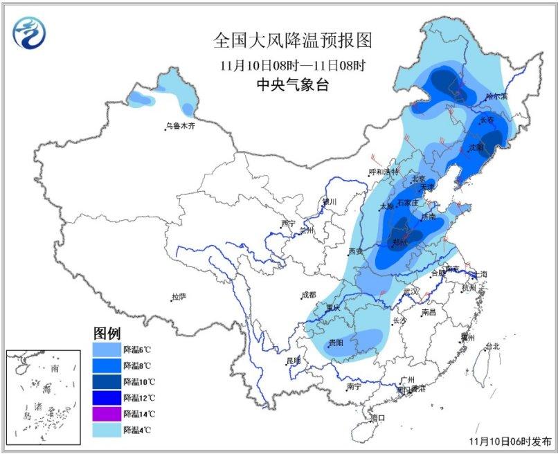 預計,10日08時至11日08時,內蒙古東部、華北、東北地區大部、黃淮、江漢、江淮北部、江南西部、陜西東部、貴州東部等地最低氣溫或平均氣溫將下降4~6℃,其中,內蒙古東北部、東北地區中南部、華北中南部、黃淮北部等地的部分地區降溫幅度可達8~10℃,上述地區將伴有4~6級風,陣風可達7級。11日凌晨,最低氣溫0℃線將位于甘肅南部、陜西關中平原北部、河北南部至遼東半島南部一帶。中央氣象臺11月10日06時繼續發布寒潮藍色預警。