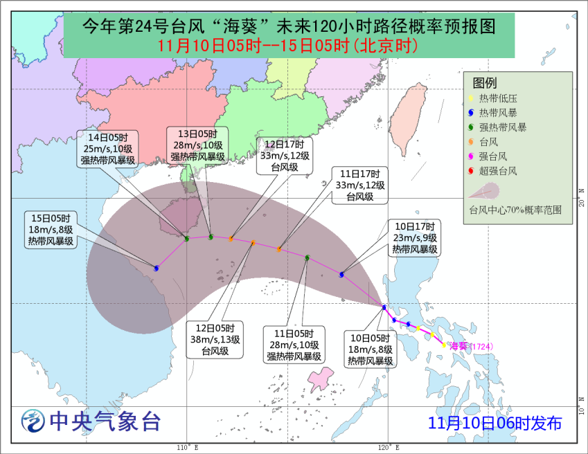 菲律賓群島附近熱帶低壓已于昨天晚上發展成為今年第24號臺風“海葵”,今天(10日)早晨5點鐘其中心位于海南三沙市永興島東偏南方向約830公里,就是北緯14.8度、東經119.8度。預計,“海葵”將以每小時25公里左右的速度向西北方向移動,強度逐漸加強,將于今天上午進入南海東部海域,爾后逐漸向海南島東南部一帶沿海靠近,強度逐漸加強,最強可達臺風級。受臺風影響,10日08時到11日08時,南海大部將有7~8級大風,陣風9~10級,南海中部偏東的局部海域將有9~10級大風,陣風可達11級。中央氣象臺10日06時發布臺風藍色預警。
