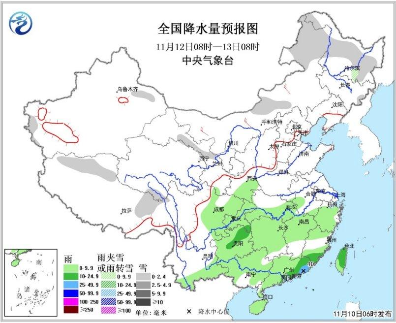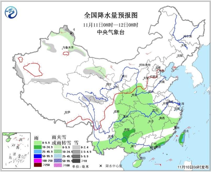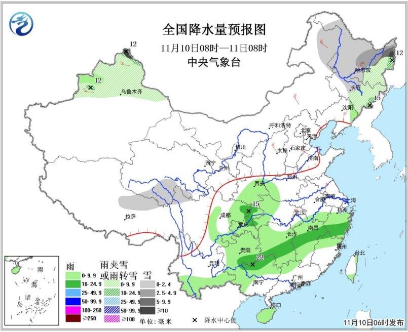 10日08時至11日08時,黑龍江東北部有明顯降雪。東北地區中北部、新疆北部、青海南部等地有小到中雪或雨夾雪,其中,黑龍江東北部、新疆阿勒泰北部山區的部分地區有大雪,局地暴雪;浙江南部、江西中北部、湖南中部、貴州南部、廣西北部、四川盆地東北部、重慶中北部等地的部分地區有中雨。內蒙古中東部、華北、東北、黃淮、江淮等地有4~6級偏北風,陣風可達7級。