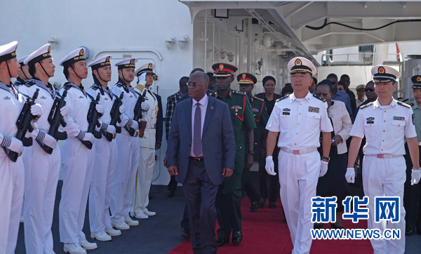 11月26日,在坦桑尼亞達累斯薩拉姆港,坦桑尼亞總統馬古富力(前右三)檢閱中國海軍和平方舟醫院船水兵儀仗隊。新華社發(江山 攝)