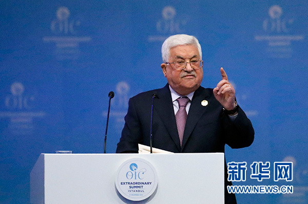 12月13日,在土耳其伊斯坦布爾,巴勒斯坦國總統阿巴斯在伊斯蘭合作組織特別首腦會議上講話。新華社/阿納多盧通訊社