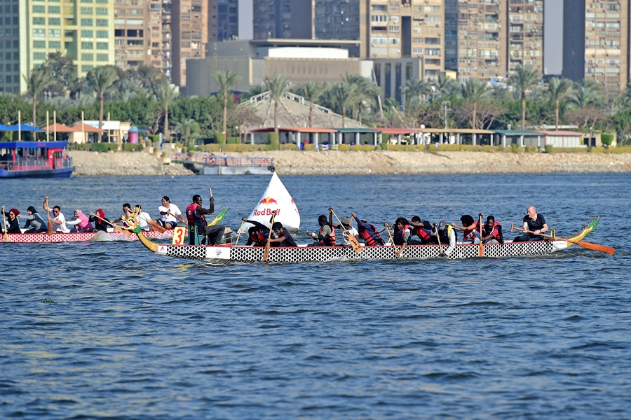 “歡樂春節”尼羅河龍舟大賽在埃及開羅尼羅河畔舉行。(圖片來源:新華社)