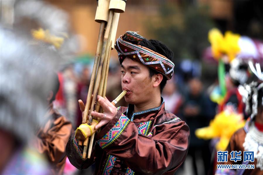 2月24日,融安縣長(zhǎng)安鎮(zhèn)安寧村大袍屯苗族群眾在吹奏蘆笙。新華社記者 張愛(ài)林?jǐn)z