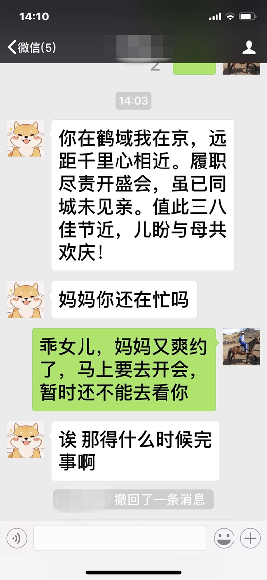 “你在鶴城我在京,遠(yuǎn)距千里心相近。履職盡責(zé)開盛會(huì),雖已同城未見親。值此三八佳節(jié)近,兒盼與母共歡慶!”