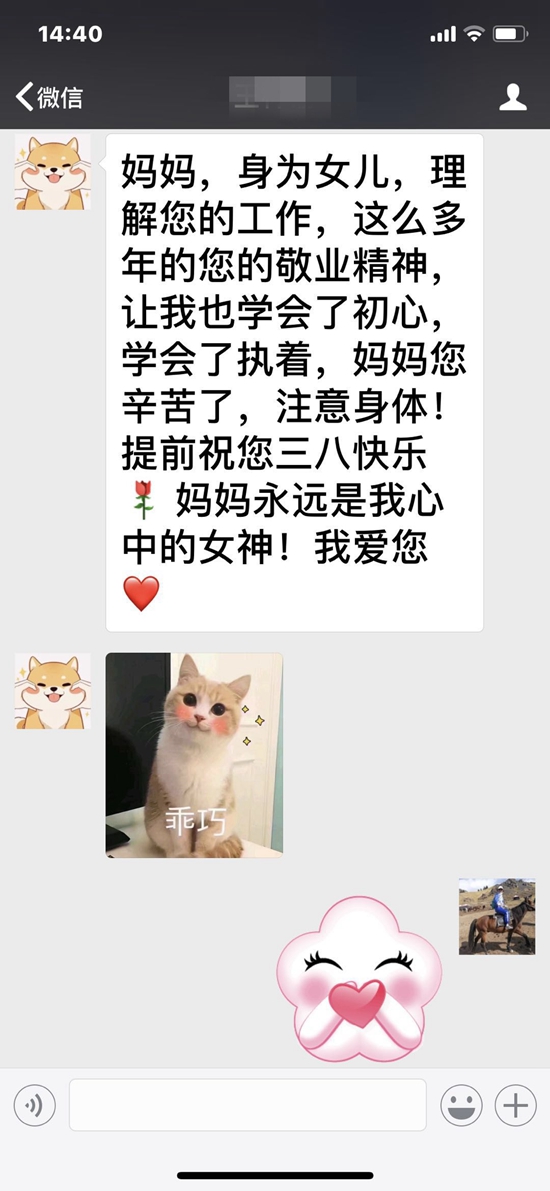 半個(gè)多小時(shí)后,女兒又給她發(fā)微信說:“媽媽,身為女兒,理解您的工作,這么多年的您的敬業(yè)精神,讓我也學(xué)會(huì)了初心,學(xué)會(huì)了執(zhí)著,媽媽您辛苦了,注意身體!提前祝您三八快樂(一枝玫瑰花)媽媽永遠(yuǎn)是我心中的女神!我愛您(一顆紅心)”。