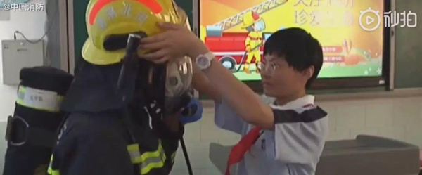 老師指引思羽摘下消防員頭盔