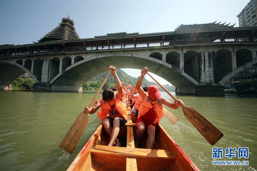 6月3日,在貴州省銅仁市玉屏侗族自治縣舞陽河上,龍舟隊進行訓練。 端午將至,人們參加多彩民俗活動迎接傳統節日的到來。 新華社發(歐秀燈攝)