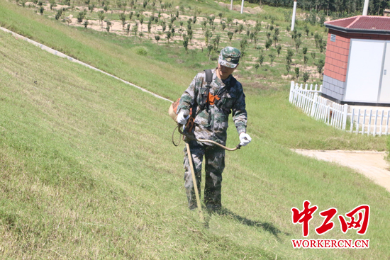 李濤在修剪堤防草皮。中工網記者 朱晶晶 攝
