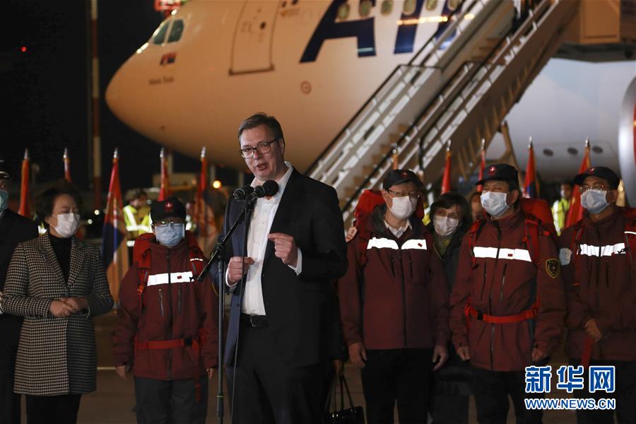 3月21日,在塞爾維亞首都貝爾格萊德,塞爾維亞總統武契奇(前)在歡迎中國援助塞爾維亞抗疫醫療專家組的儀式上致辭。由中國國家衛生健康委員會組建、廣東省衛健委選派的6名中國專家當天抵達貝爾格萊德,一批由中國政府捐贈的醫療物資也同機抵達。 新冠肺炎疫情發生以來,習近平主席時刻關注國內外疫情形勢,高度重視抗疫國際合作,多次作出重要指示批示,頻頻開展元首外交,從構建人類命運共同體高度,親自推動疫情防控國際合作。 新華社記者石中玉攝