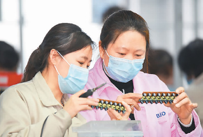 近期,湖南省郴州市嘉禾縣經(jīng)開(kāi)區(qū)園區(qū)72家制造、裝備企業(yè)全部復(fù)工復(fù)產(chǎn),產(chǎn)能迅速回升,經(jīng)濟(jì)指標(biāo)基本恢復(fù)往年同期水平。圖為該經(jīng)開(kāi)區(qū)的百俊達(dá)電子科技有限公司女工們?cè)诩庸どa(chǎn)電子配件。