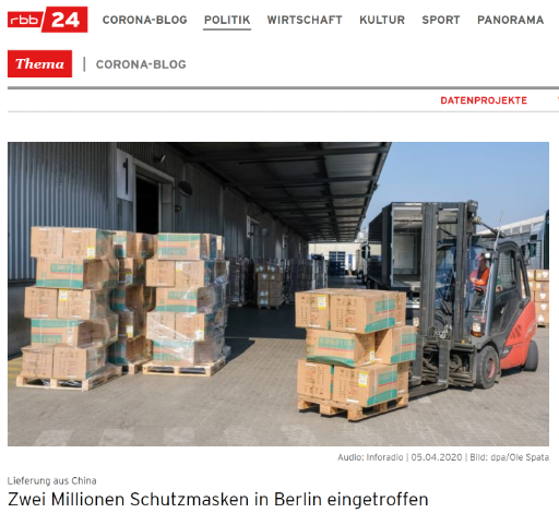 △來自中國的交貨 200萬件防護口罩抵達德國柏林(圖片來源:德國rbb官網)