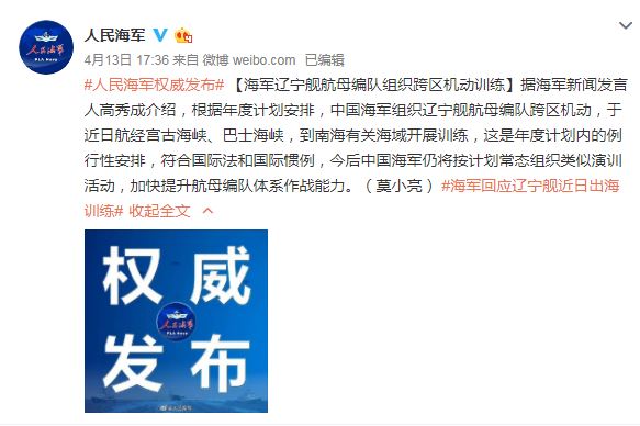中國臺灣網4月14日北京訊 4月13日,據海軍新聞發言人高秀成介紹,根據年度計劃安排,中國海軍組織遼寧艦航母編隊跨區機動,于近日航經宮古海峽、巴士海峽,到南海有關海域開展訓練,這是年度計劃內的例行性安排,符合國際法和國際慣例,今后中國海軍仍將按計劃常態組織類似演訓活動,加快提升航母編隊體系作戰能力。(完)