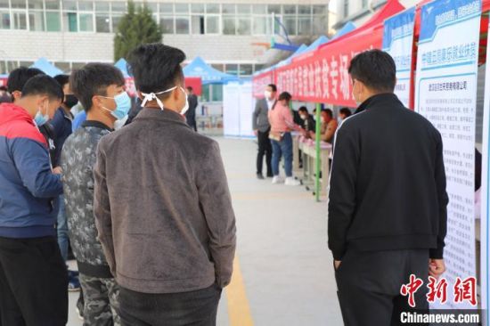 4月中旬,甘肅省臨夏回族自治州康樂縣迎來扶貧專場招聘會。圖為當地民眾在招聘會現場咨詢!×秩鹣 攝