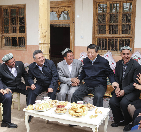 2014年4月27日至30日,中共中央總書記、國家主席、中央軍委主席習(xí)近平在新疆考察。這是4月28日上午,習(xí)近平在疏附縣托克扎克鎮(zhèn)阿亞格曼干村村民阿卜都克尤木·肉孜家同村民座談。新華社記者 蘭紅光 攝