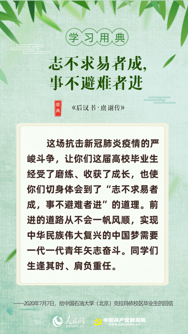【編者按】“志不求易者成,事不避難者進!苯,習近平總書記給中國石油大學(北京)克拉瑪依校區畢業生回信,對廣大高校畢業生提出殷切期望!叭松谇冢趧t不匱”“積土而為山,積水而為!薄陙恚暯蕉啻我迷娋涞涔,激勵包含廣大青年在內的全黨全國各族人民拼搏奮進、埋頭苦干。正值“戰疫”“戰貧”關鍵時刻,人民網·中國共產黨新聞網與您一起回顧習近平講話中關于“奮斗”的10個名句。