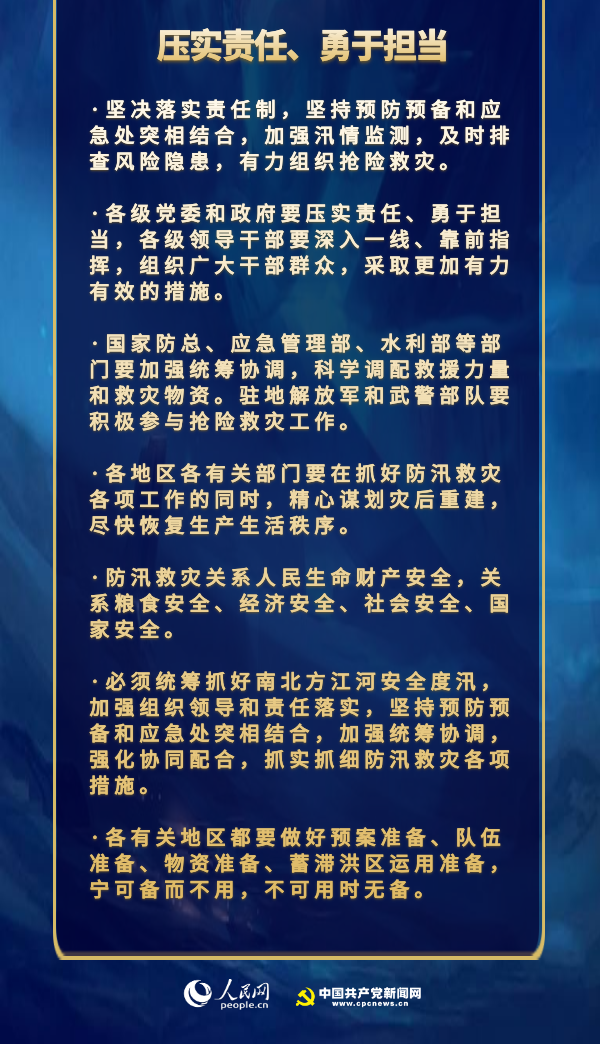 針對各有關地區、部門和單位的工作重點,習近平也作出重要指示,指出必須統籌抓好南北方江河安全度汛,加強組織領導和責任落實,堅持預防預備和應急處突相結合,加強統籌協調,強化協同配合,抓實抓細防汛救災各項措施——