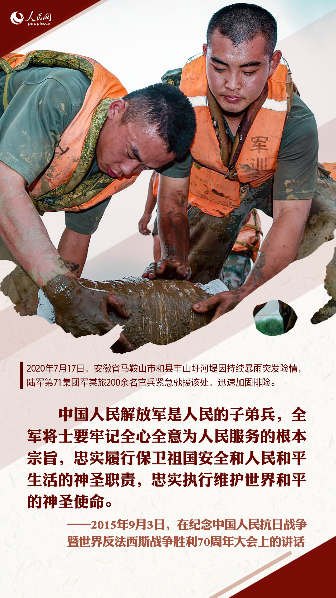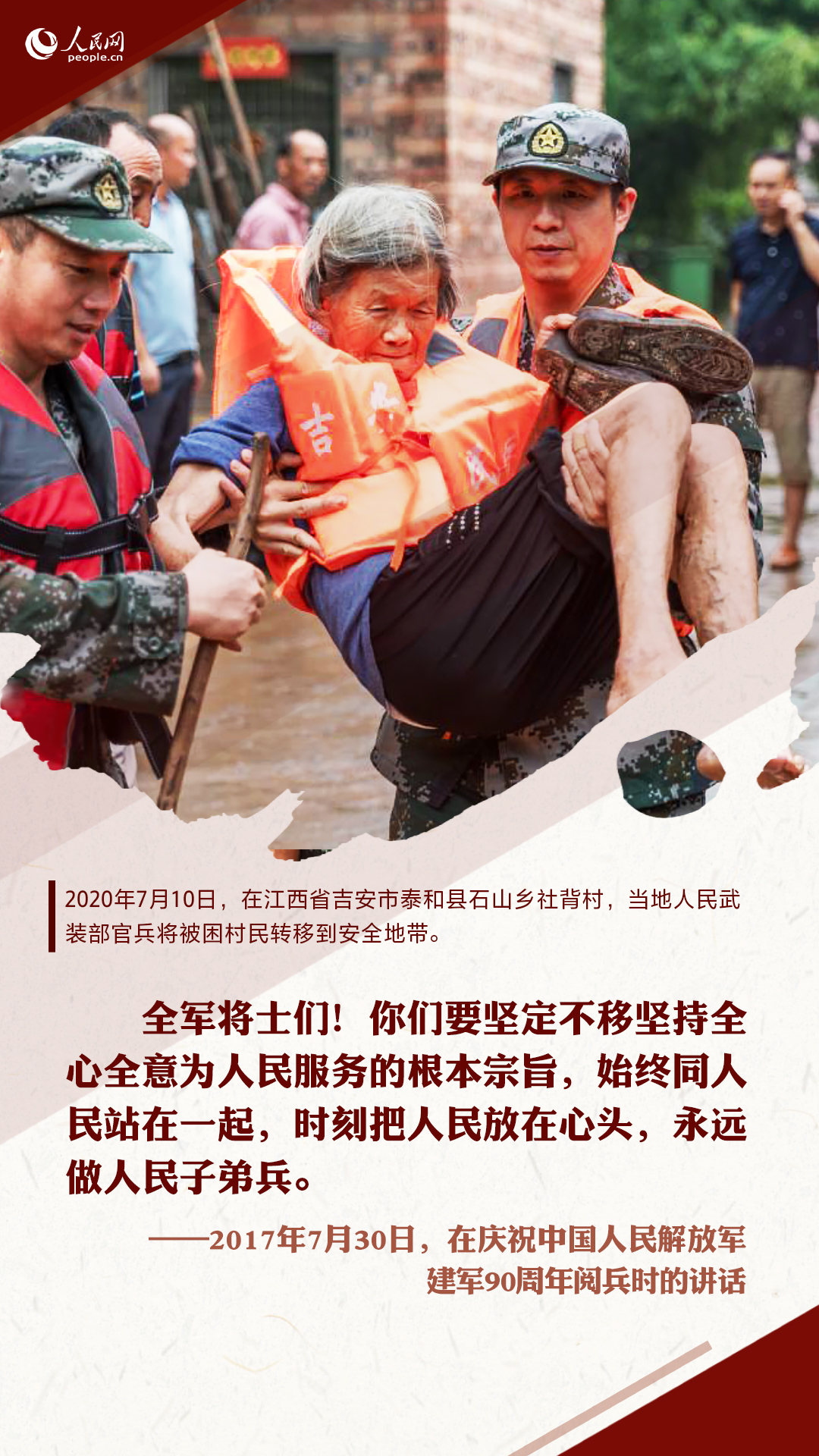 十八大以來,習近平在多個重要場合囑托人民子弟兵要全心全意為人民服務。這些話語,猶在耳畔,人民網圖解新聞制作一組海報,重溫習近平的殷殷囑托,并致敬與洪水戰斗的人民子弟兵!