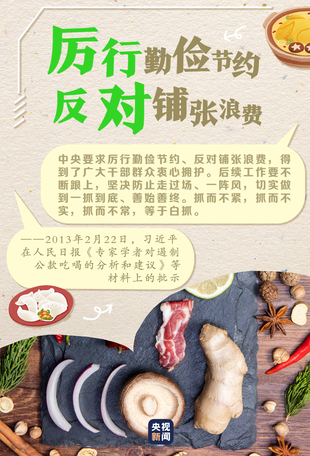 “要采取針對性、操作性、指導性強的舉措,加強監督檢查,鼓勵節約,整治浪費。” 2013年1月17日,習近平在新華社《網民呼吁遏制餐飲環節“舌尖上的浪費”》的材料上作出批示。