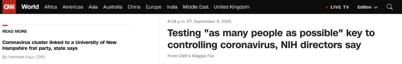 據(jù)美國(guó)有線電視新聞網(wǎng)(CNN)8日?qǐng)?bào)道,來(lái)自美國(guó)國(guó)立衛(wèi)生研究院下屬研究機(jī)構(gòu)美國(guó)國(guó)家兒童健康與人類發(fā)展研究所、美國(guó)國(guó)立醫(yī)學(xué)圖書(shū)館、美國(guó)國(guó)立心肺血液研究所、美國(guó)國(guó)立精神衛(wèi)生研究所等單位的11名主任,聯(lián)合撰寫(xiě)了一篇博文,文章明確指出,“盡可能多地進(jìn)行檢測(cè)”對(duì)于抗擊疫情大流行至關(guān)重要。