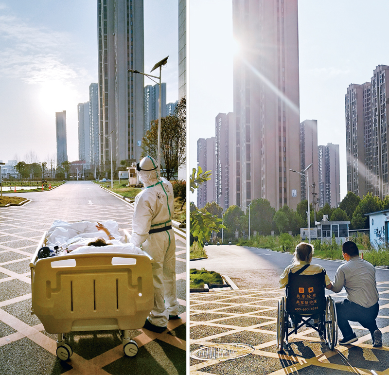 左圖為2020年3月5日,在武漢大學(xué)人民醫(yī)院東院,復(fù)旦大學(xué)附屬中山醫(yī)院援鄂醫(yī)療隊(duì)隊(duì)員、“90后”醫(yī)生劉凱在護(hù)送已住院近一個(gè)月的87歲老人王欣做CT的途中停下來,一起欣賞了一次久違的日落(甘俊超/攝)。右圖為時(shí)隔半年,9月4日,兩個(gè)人在武漢大學(xué)人民醫(yī)院東院重逢,重現(xiàn)攜手看夕陽的溫馨一刻(汪亭玉/攝)。武漢大學(xué)人民醫(yī)院 杜巍巍供圖