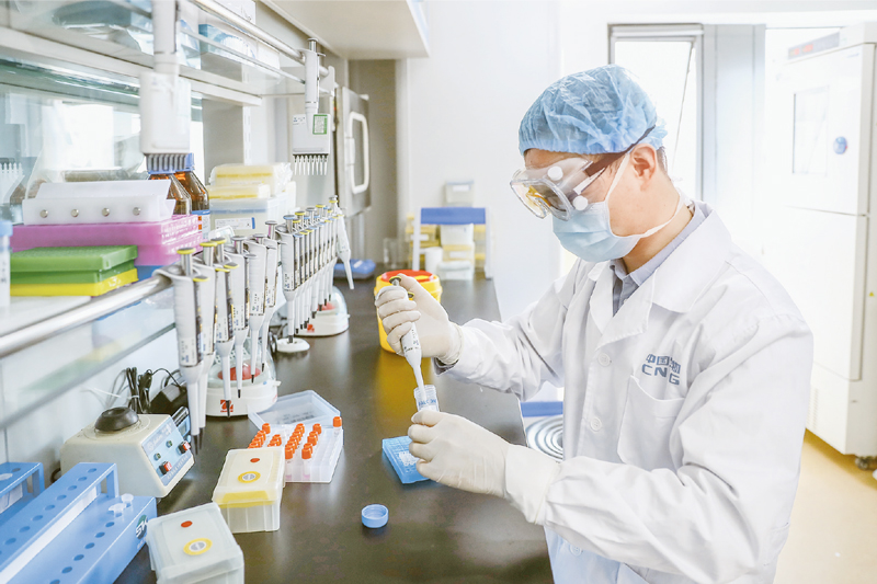 2020年4月11日,工作人員在國藥集團(tuán)中國生物新冠疫苗生產(chǎn)基地質(zhì)量檢定部門對(duì)新型冠狀病毒滅活疫苗樣品進(jìn)行雜質(zhì)檢測(cè)。新華社記者 張玉薇/攝