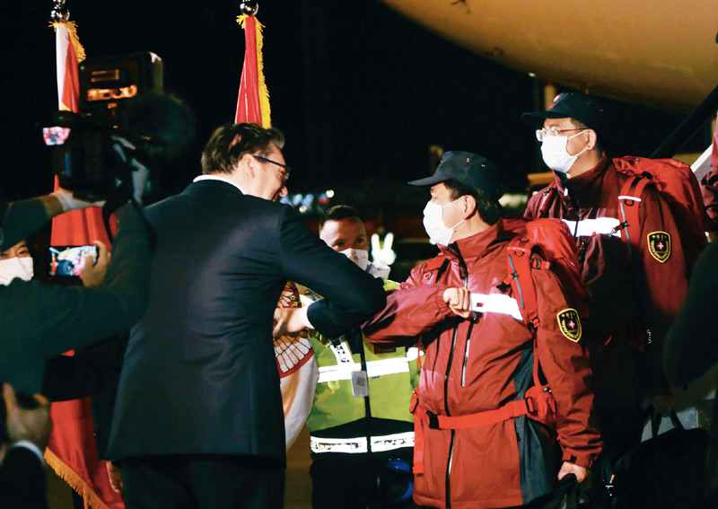 2020年3月21日,在塞爾維亞首都貝爾格萊德,前來迎接的塞爾維亞總統(tǒng)武契奇(左)與中國援助塞爾維亞抗疫醫(yī)療專家組成員“碰肘”致意。6名中國專家當(dāng)天抵達(dá)貝爾格萊德,一批由中國政府捐贈(zèng)的醫(yī)療物資也同機(jī)抵達(dá)。新華社記者 石中玉/攝