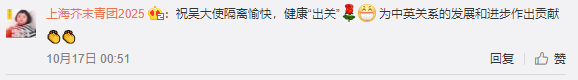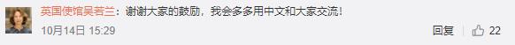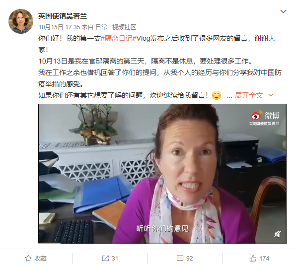 前不久,英國新任駐華大使吳若蘭(Caroline Wilson)抵達北京開始任期,12日,她在自己的個人微博上發布消息說,回到了官邸開始為期14天的隔離。隔離期間,她用中文錄制了隔離日記Vlog,大贊中國的防疫措施和衛生人員專業。