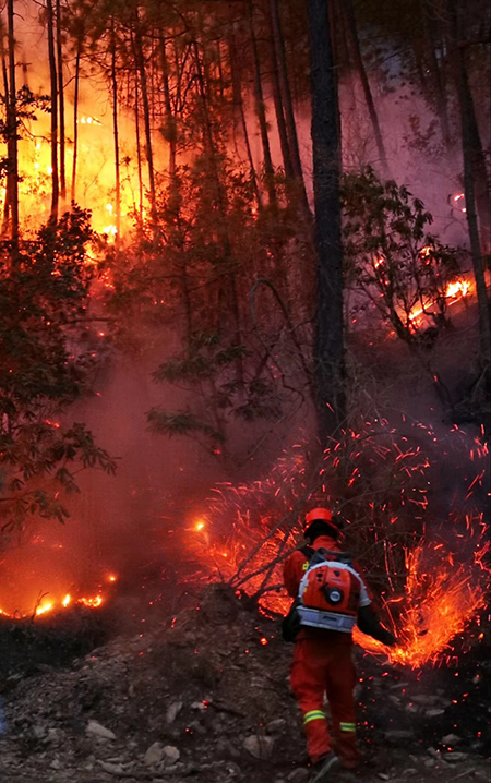 2019年3月,在涼山木里火場,王鵬和戰(zhàn)友連續(xù)奮戰(zhàn)10余天,成功將大火撲滅。王鵬身背滅火機(jī)撲打明火。
