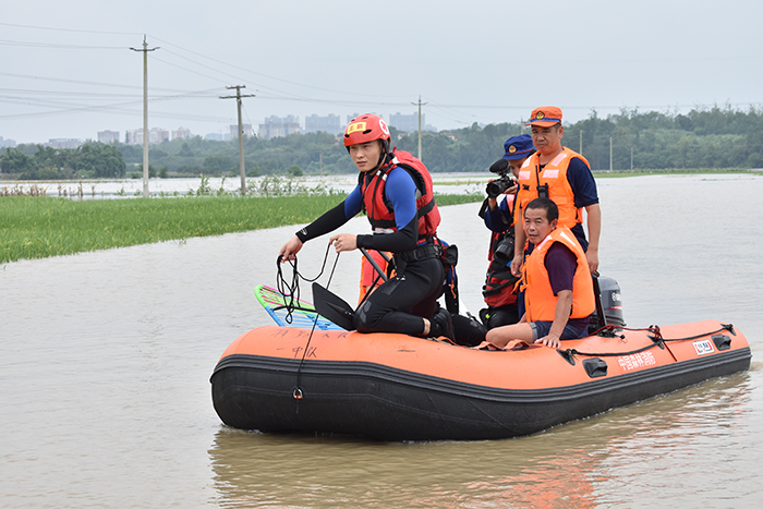 8月17日,四川省成都市金堂縣發(fā)生洪澇災(zāi)害,部分村莊房屋被洪水淹沒。王鵬(左前一)和戰(zhàn)友乘坐橡皮艇挨家挨戶搜尋轉(zhuǎn)移被困群眾?堪肚,王鵬準(zhǔn)備將安全繩拋給戰(zhàn)友,以便精準(zhǔn)?。