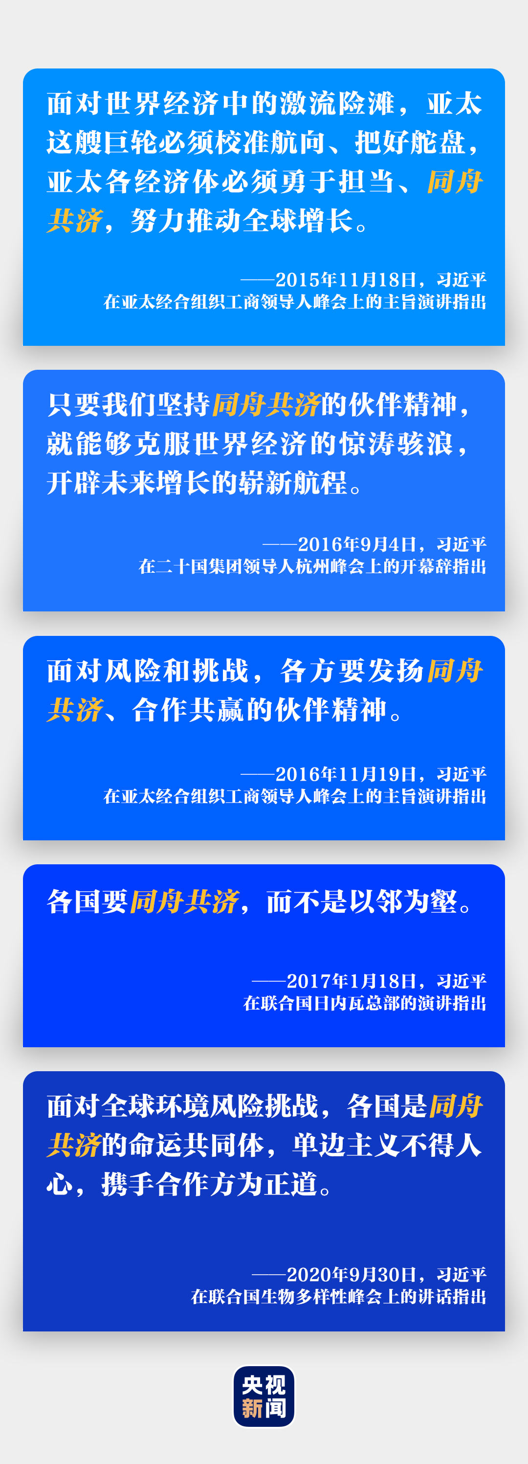 兩年前的11月17日,習(xí)近平出席亞太經(jīng)合組織工商領(lǐng)導(dǎo)人峰會,在主旨演講中,他強(qiáng)調(diào)“我們同在一條船上,一起謀劃發(fā)展合作,具有特別的意義”,提出要“握穩(wěn)舵盤、把準(zhǔn)航向、齊力劃槳、乘風(fēng)破浪”。他還多次在多邊組織峰會、聯(lián)合國系列高級別會議等場合呼吁“同舟共濟(jì)”。