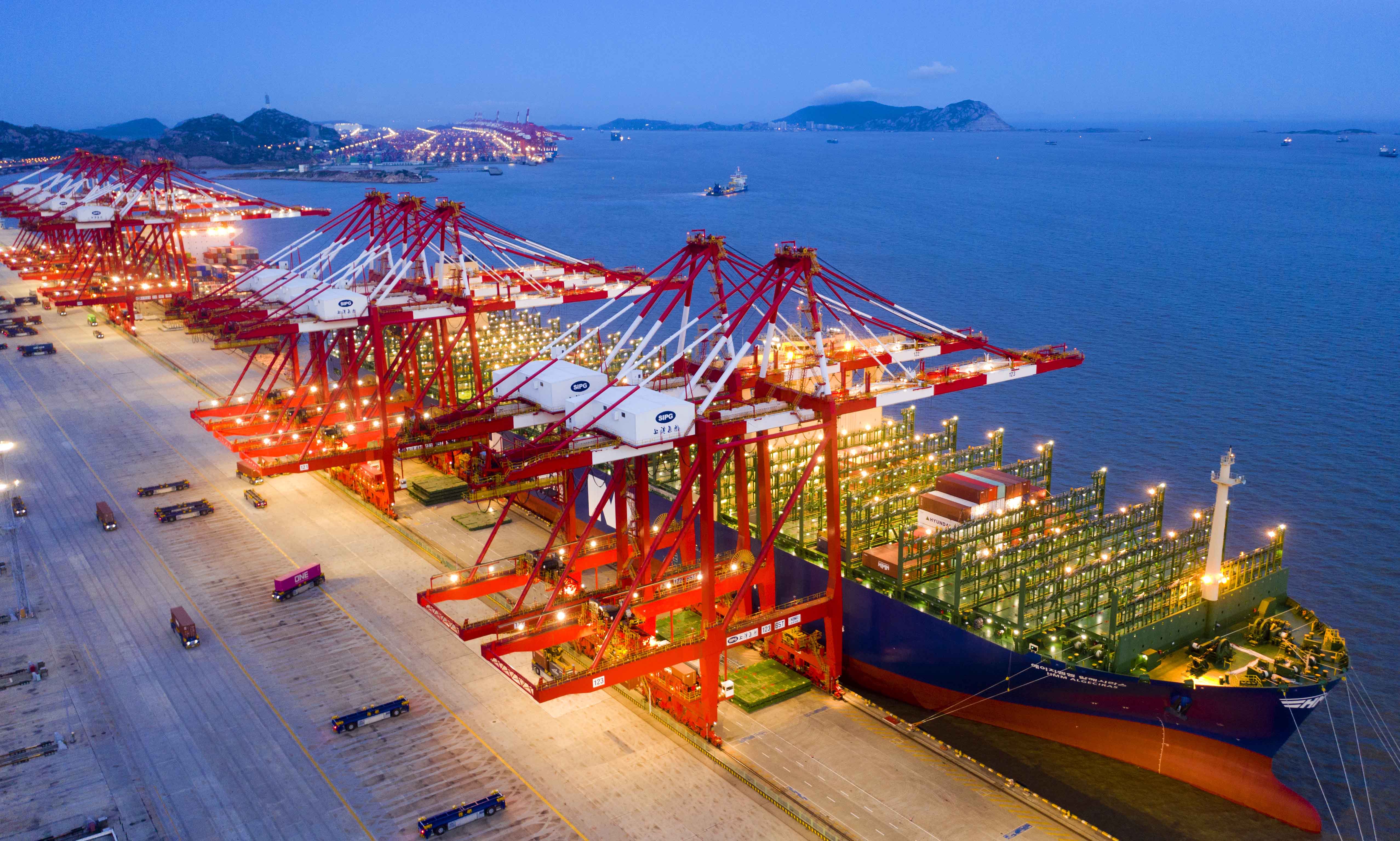 △燈火通明的上海洋山深水港自動化碼頭