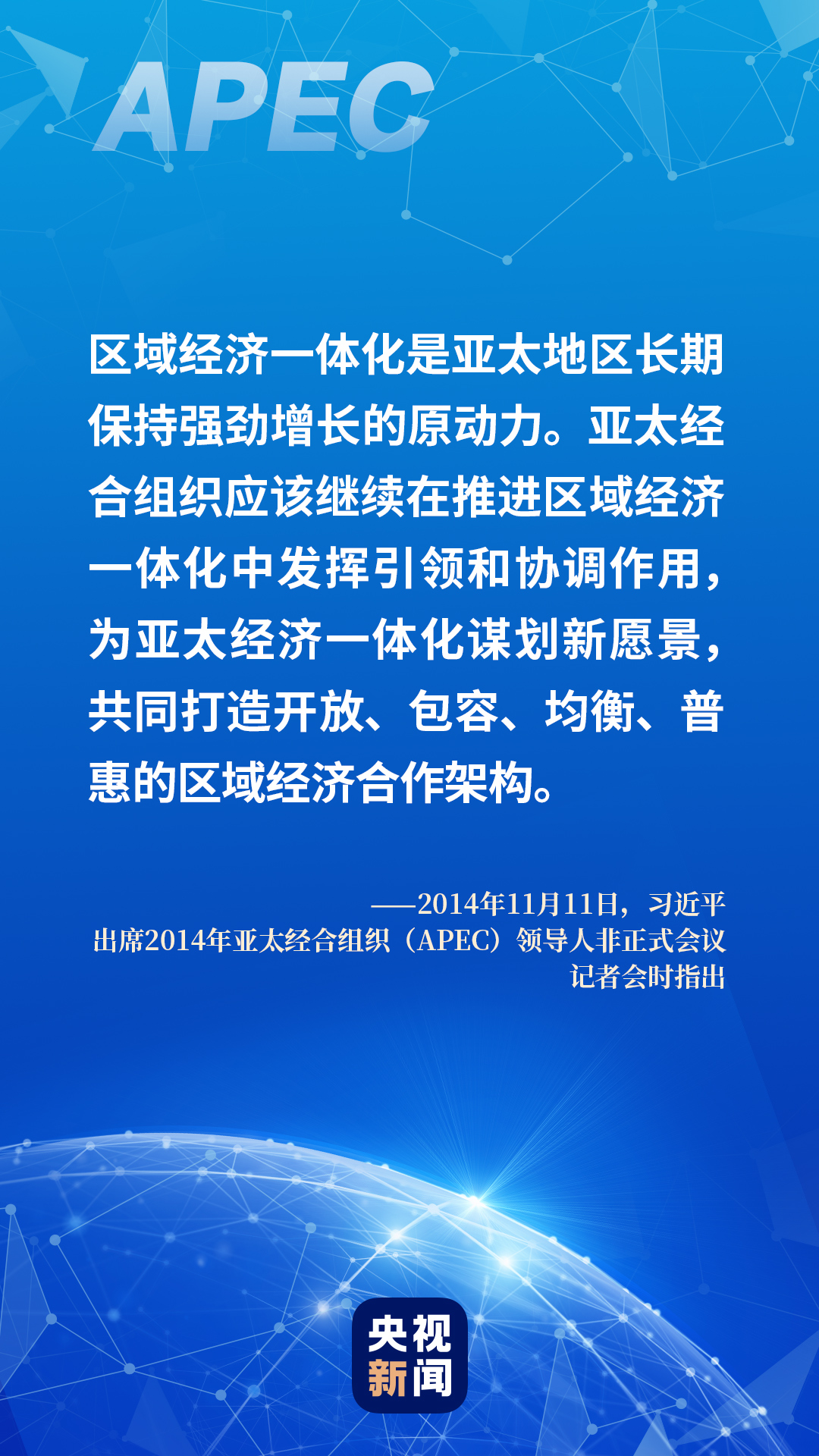 “世界是不可分割的命運(yùn)共同體”。11月19日,習(xí)近平在北京以視頻方式出席亞太經(jīng)合組織工商領(lǐng)導(dǎo)人對話會并發(fā)表主旨演講。他再次強(qiáng)調(diào),要深化命運(yùn)共同體意識,持續(xù)推進(jìn)區(qū)域經(jīng)濟(jì)一體化。