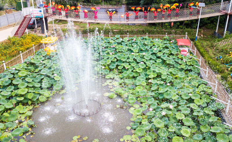 △2020年7月14日,河北省饒陽縣王同岳鎮王同岳村村民在廢棄坑塘改造的小花園內排練節目。