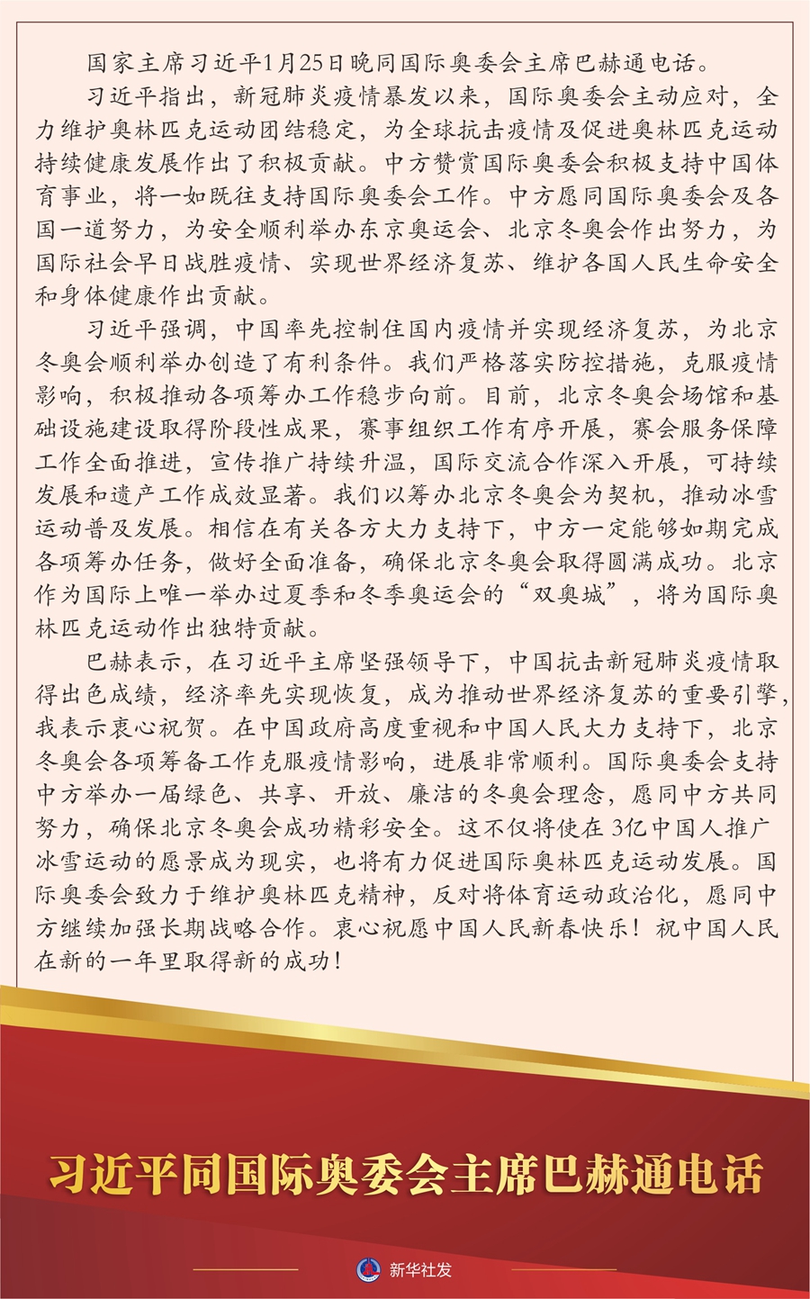 新華社北京1月25日電 國家主席習近平1月25日晚同國際奧委會主席巴赫通電話。