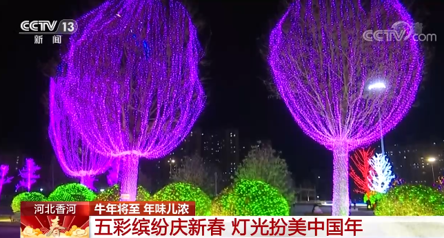 在河北廊坊市香河縣,城區亮化景觀和節日彩燈全部點亮。新城公園、五一公園等重要節點的亮化光源裝飾一新,街道兩側的行道樹上纏繞著五彩繽紛的線燈,營造出錯落有序、層次鮮明的亮麗夜景。街道兩側一串串火紅的燈籠,烘托出濃濃的年味。