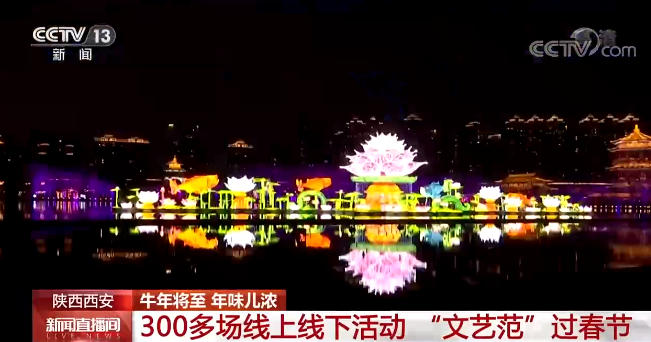 今年春節期間,陜西西安市組織了5大系列300余項線上線下活動,給居民們送上豐富的文化大餐。在大唐芙蓉園,水陸花燈絢麗多彩,“荷塘月色”“悅動花海”“愛之戀”等燈組展現出滿園春色,傳遞著幸福喜悅。