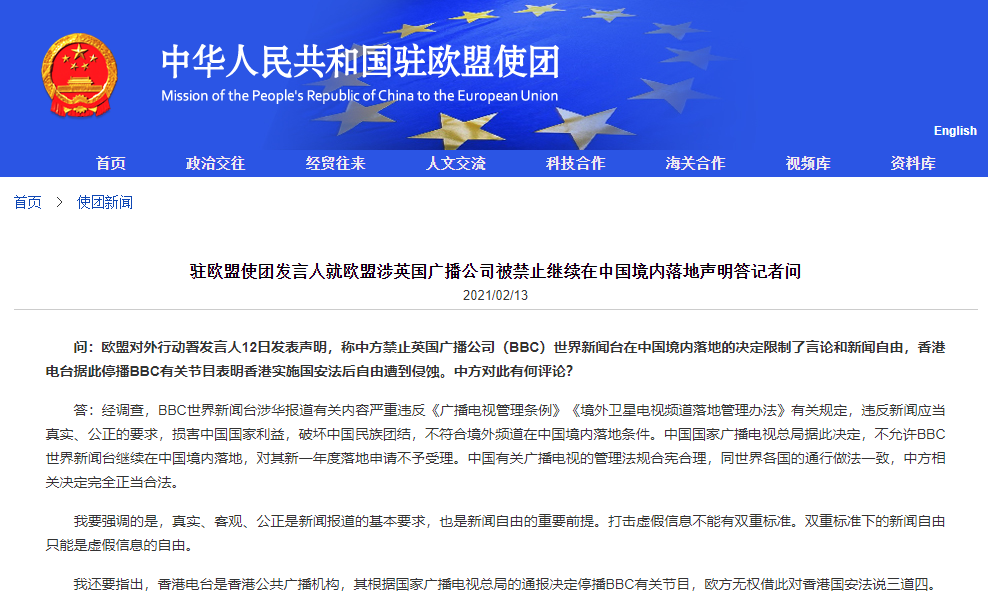 中國駐歐盟使團(tuán)發(fā)言人就歐盟涉英國廣播公司被禁止繼續(xù)在中國境內(nèi)落地聲明答記者問
