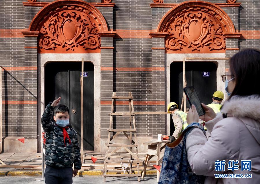 2月4日,上海市民林女士在修繕中的中共一大會址前為小學三年級的兒子拍照。新華社記者 劉穎 攝