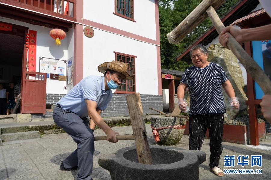 游客在江西省井岡山市神山村村民左秀發家體驗手打糍粑(2020年7月15日攝)。新華社記者 彭昭之 攝
